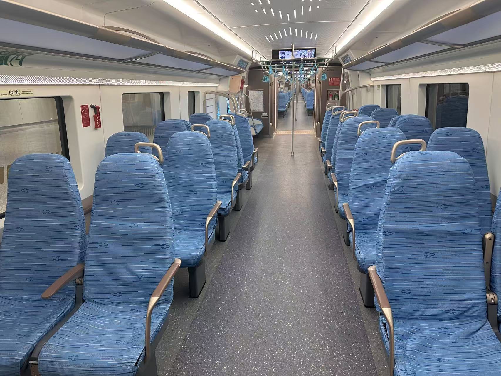 不同于地铁车厢的纵向排列的作为,此次市域铁路的作为为横向排列,且座位较多,避免乘客长时间站立。同时,列车设计人性化,设有行李架、无线充电装置等设施,提升了乘客的舒适度和便利性。