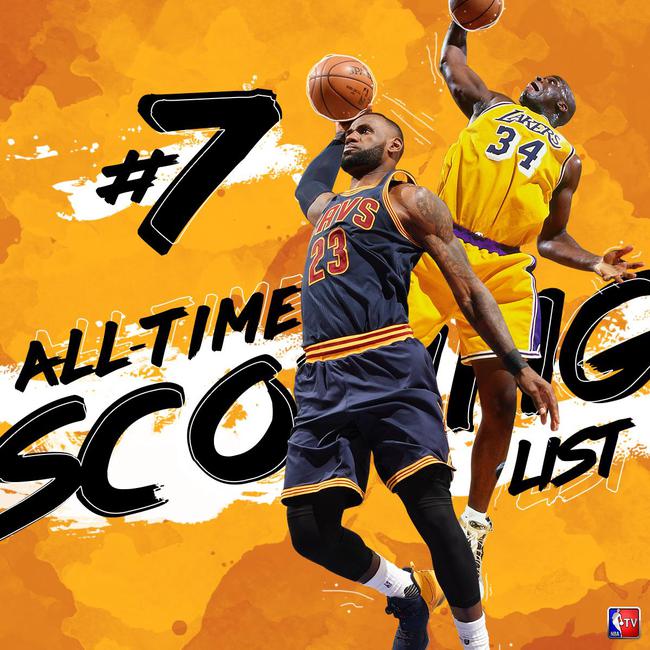 比赛打到最后4分28秒,詹姆斯获得三次罚球机会,虽然只是3罚中1,但这一球仍然帮助他实现了对奥尼尔的超越。至此,他取代了28596分的奥尼尔,正式成为NBA历史上常规赛得分第七高的球员。目前排在詹皇身前的六名球员还剩下“天钩”贾巴尔(38387分)、卡尔·马龙(36928分)、科比·布莱恩特(33643分)、迈克尔·乔丹(32292分)、威尔特·张伯伦(31419分),以及德克·诺维茨基(30181分)。