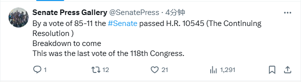 当地时间12月21日,美国参议院以85票对11票的结果通过临时拨款法案,预计拜登将在21日签署该法案。美国国会于今年9月通过的临时拨款法案于当地时间12月20日午夜到期,国会必须采取新的立法行动,为联邦政府继续运转提供资金,否则美国联邦政府部分机构将陷入“停摆”。