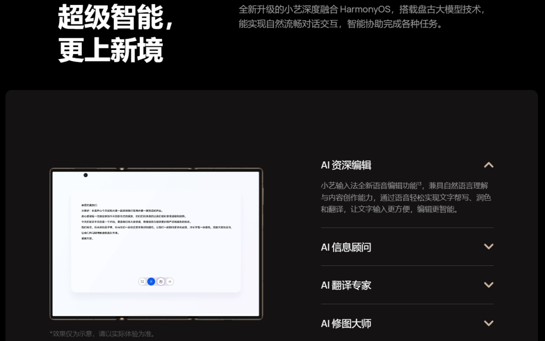 折叠屏可以承载更多元的办公、娱乐等功能,应用服务也比直板机更加繁多,AI进入折叠屏,相当于配备了一个私人助理,让服务唤起化繁为简。比如华为Mate XT非凡大师、华为Mate X6搭载的小艺,就能够完成智能分屏,根据屏幕内容回答用户提问,或者处理文档,提供AI资深编辑、AI信息顾问、AI修图大师、AI翻译专家等一系列智能服务。小米MIX Fold4的小爱同学,由AI多模态赋予了听说读写等能力,响应用户的多种服务需求。