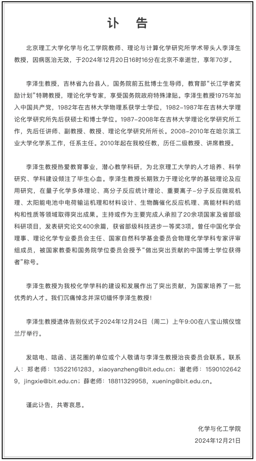 12月21日,北京理工大学化学与化工学院发布讣告:北京理工大学化学与化工学院教师、理论与计算化学研究所学术带头人李泽生教授,因病医治无效,于2024年12月20日16时16分在北京不幸逝世,享年70岁。讣告显示,李泽生教授,吉林省九台县人,国务院前五批博士生导师,教育部“长江学者奖励计划”特聘教授,理论化学专家,享受国务院政府特殊津贴。