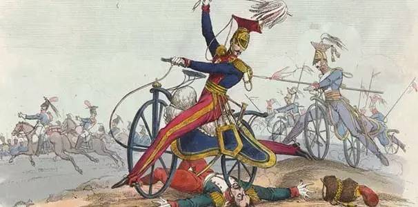▲一个脑洞大开的漫画家画的一副反映自行车骑兵击败真正骑兵的画作,这幅画虽属无稽之作,但是却也从一个侧面反映了欧洲人对自行车军事价值的认可