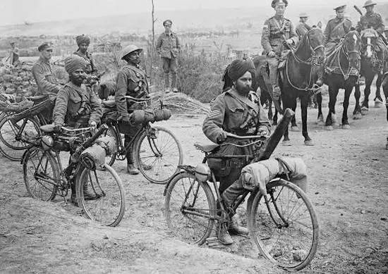 ▲图为一战时期英军的自行车部队,这些士兵是在英军中服役的印度兵