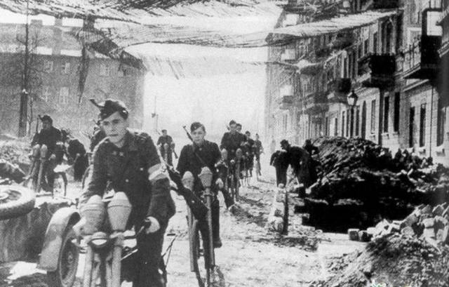 ▲柏林战役中的德军自行车部队,其车把前面所携带的装备为“铁拳”火箭筒