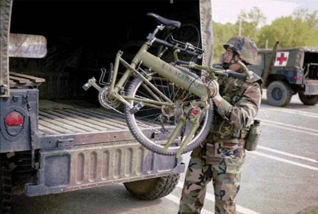 二战后,美军已成为全球最强大的武装力量,但其依旧对自行车青睐有加。为了提升部队在复杂地形条件下的作战能力,美国军方对军用自行车的研发与装备工作十分重视。在本世纪初的阿富汗战争和伊拉克战争中,美国军方将军用折叠自行车定为斯诺克装甲车和悍马越野车的专属装备。一旦战车在战场上受创、抛锚,或者说遇到了无法行驶的地形,美国大兵们就可以骑着轻巧简便的军用自行车去执行随后的军事任务。
