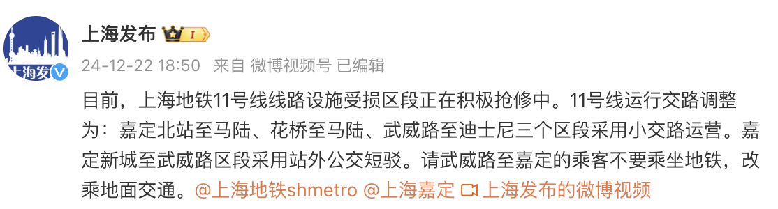 @上海发布 微博消息,目前,上海地铁11号线线路设施受损区段正在积极抢修中。11号线运行交路调整为:嘉定北站至马陆、花桥至马陆、武威路至迪士尼三个区段采用小交路运营。嘉定新城至武威路区段采用站外公交短驳。请武威路至嘉定的乘客不要乘坐地铁,改乘地面交通。此外,从嘉定前往武威路换乘轨交短驳车间隔缩短至15分钟,按照目前的保障方案,保障时间将一直延续到各轨交站点原本运营时间结束。