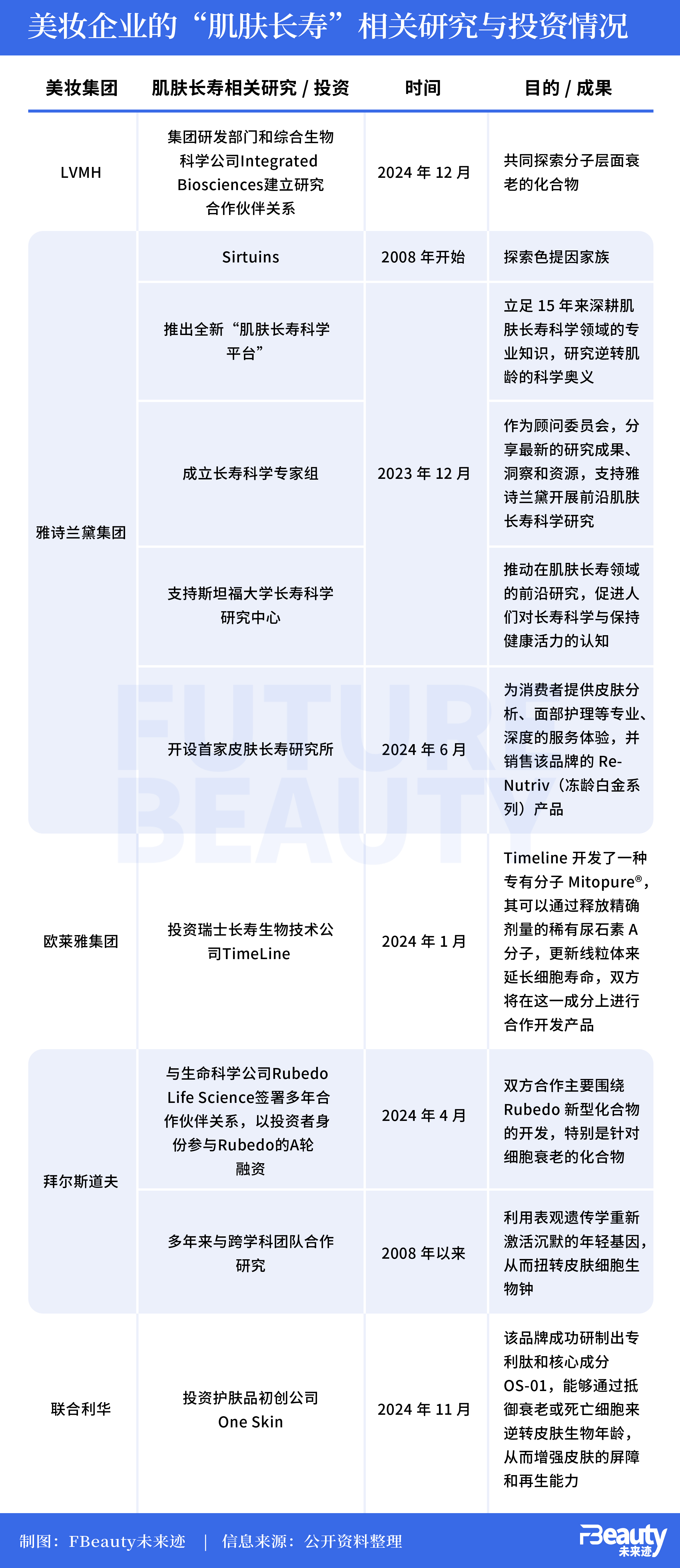 《FBeuty未来迹》梳理发现,近两年来,LVMH、雅诗兰黛、欧莱雅、拜尔斯道夫、联合利华诸多头部美妆企业,都建立了与肌肤长寿相关的研究项目。