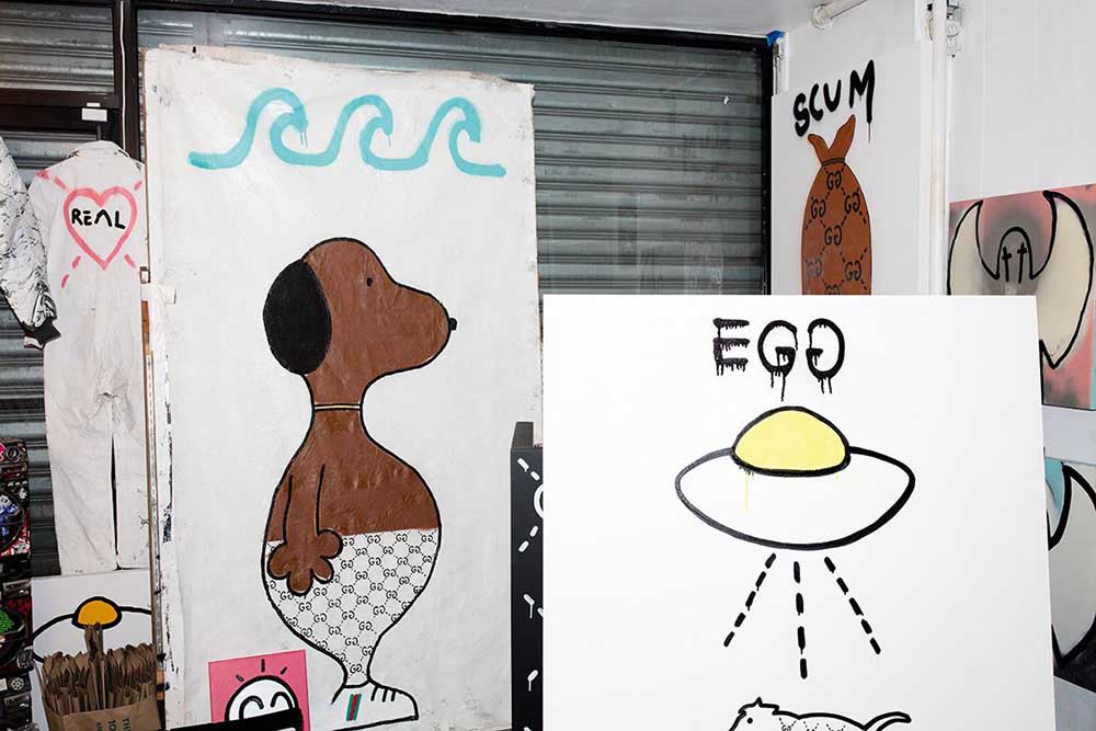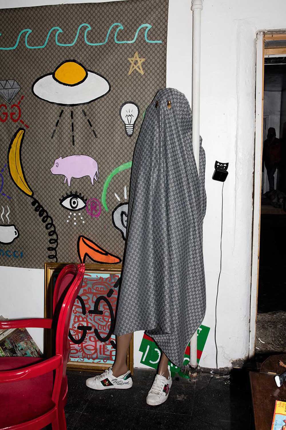 “这些仿冒品的确和品牌产生了联系,” Trevor 承认。“ Dapper Dan 做的东西不过是拼凑出视觉上相似的产物,而我的做法则原创得多,成品也许更像一个全新的产物?手工绘制,所以算是独一无二的潮物。如今的品牌能够接受这些民间小把戏,在我看来十分有趣。但我做 Gucci Ghost 的原因很单纯,就是想证明自己是可以得到品牌认可的,而突然间这就实现了。”