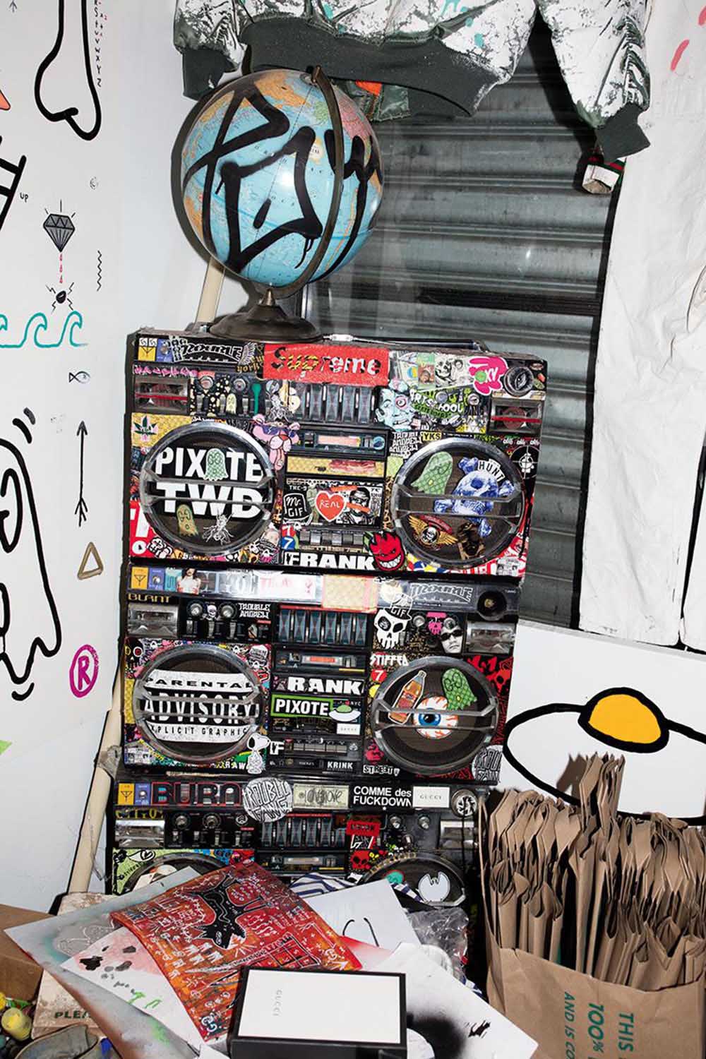他将笔记本电脑上的摄像头转了一圈,为我们展示了工作室中琳琅满目的物件,整间屋子就像一座由画板、衣服和零七八碎堆积成的小山,每个角落都充满亮点,戏谑的态度渗透于他的每一件作品中, Trevor 解释说,“因为我爱存东西,所以很多都被堆起来了,包括那些电视、唱片和作品。我妻子和三岁大的孩子很长时间没来了,这周过来看我时,屋子里陈设简直让儿子眼花缭乱,他一直在说哇哦!”