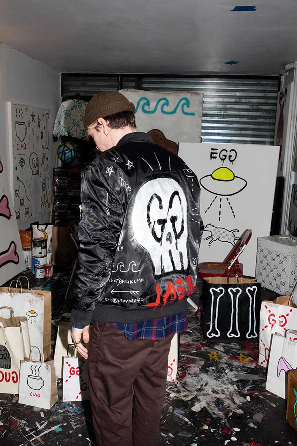 2016年,Ari 受邀为 Gucci 早秋系列拍摄型录,顺带向品牌创意总监 Alessandro Michele 介绍了 Trevor。 Alessandro 对他的作品很感兴趣,迫不及待地想和这位有着滑雪运动员经历的艺术家见面,不久后 Gucci Ghost 系列真的面世了。”我起初并不知道会和 Alessandro 擦出怎样的火花,” Trevor 回忆道。“我觉得我们可能会做一些T恤的印花之类的,我不清楚他对我之前的作品了解多少,所以我带了一满满箱子东西过来,包括自制的小物件,还有我绘制的那些帆布和纸袋。看得出来他这些东西很感兴趣。”