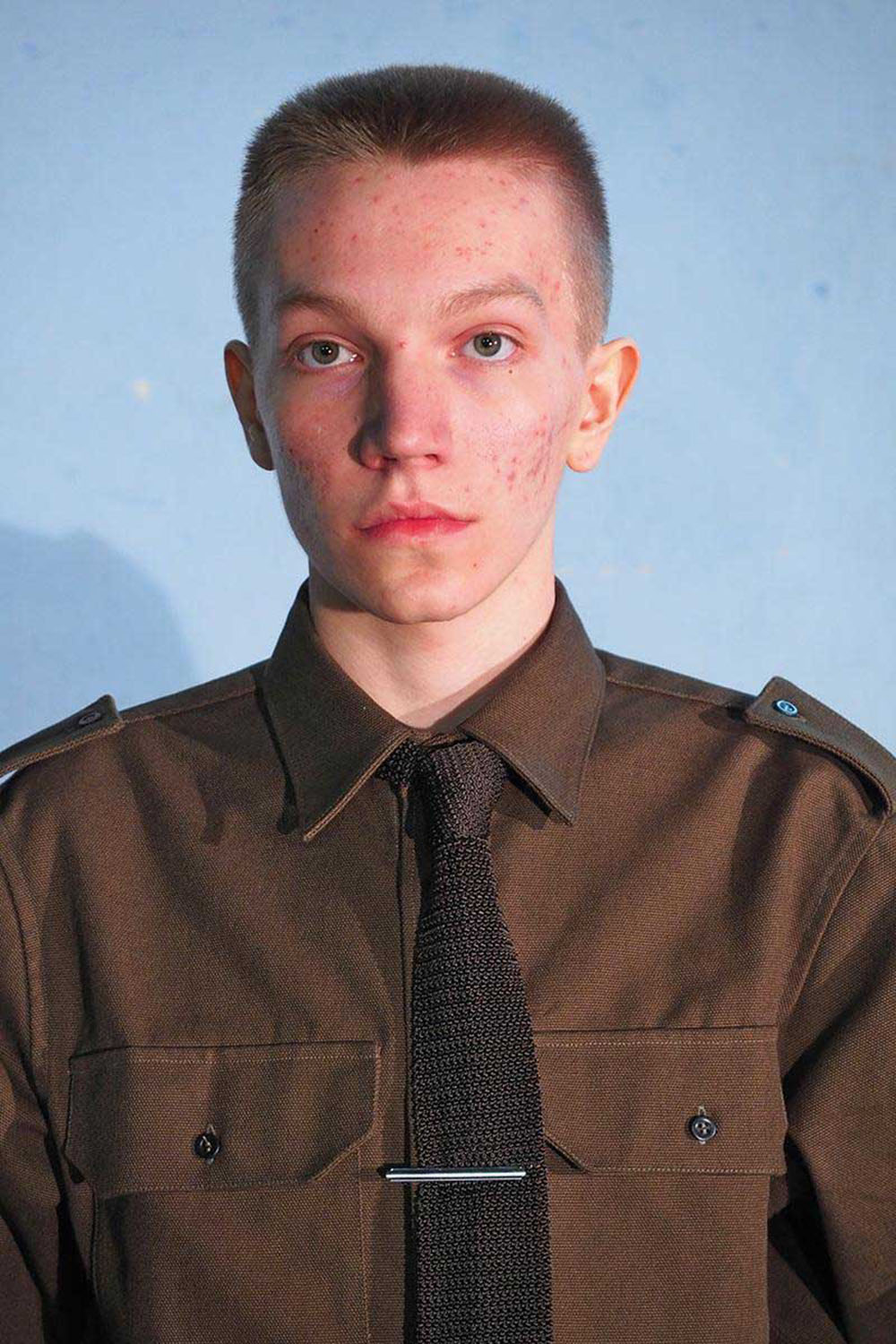 “是的,我会和别人聊性,”Artem 在酒店里耸了耸肩。“我大概从两年前开始谈论性,因为我知道我是男性,我就需要和我的兄弟们聊这个。但对于我和团队里的成员来说,情感和艺术是最有趣的话题,这些东西是真实的,是亟待讨论的。”他为Gosha的大秀录制了一张人声配乐,里面是每个模特的真实录音,他们用俄语回答着关于现实和梦想的问题。“我叫 Valentin Fufaev,今年17岁。我出生在莫斯科,现在也在那生活。我爱学习、画画和创作。我不仅是只是活着,我在生活,”这是其中一个录音。“我叫 Rodion,今年17岁,出生在西伯利亚的克拉斯诺亚尔斯克。我在写诗,并且希望有一天我的诗歌可以改变人们对世界的看法,”这是另一个录音。16岁的 Leon 则表达出了任何青少年都可感同身受的焦虑:“我只是个无名小卒,我也不知道什么时候才能有做所为。我的梦想是活过25岁。”