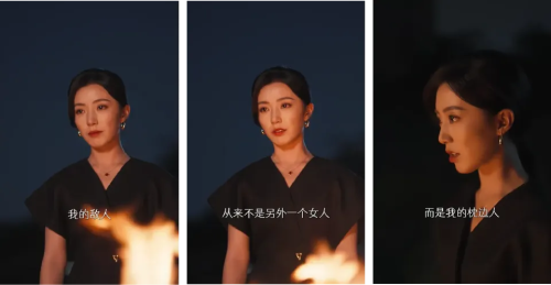 当郑萋决定烧毁老公送她的假货礼物时,拍摄地点选在了郊外的草丛中。背景是城市高楼,近处是绿色的草丛,再加上熊熊篝火,暖冷色调交织。三角形的构图中,女主坚毅的脸若隐若现,这一幕令人印象深刻。