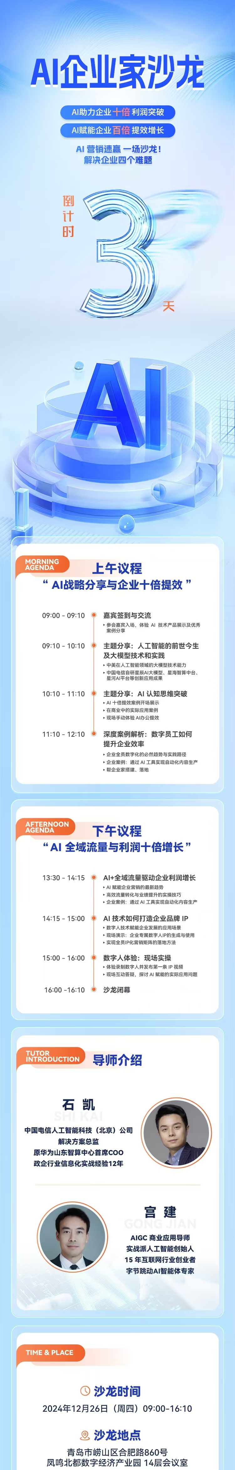 本次AI企业家沙龙将于2024年12月26日(周四)在青岛市崂山区合肥路 860 号凤鸣北都数字经济产业园14层会议室举行。这是一场汇聚前沿科技与实战经验的盛会,旨在帮助企业在AI时代抢占先机,实现跨越式发展。