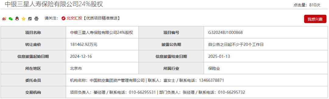 12月16日,中国航空集团有限公司(简称“中航集团”)于北京产权交易所挂牌转让中银三星人寿保险有限公司(简称“中银三星人寿”)24%股权,转让底价为18.15亿元,要求一次性支付价款,保证金为5.44亿元。