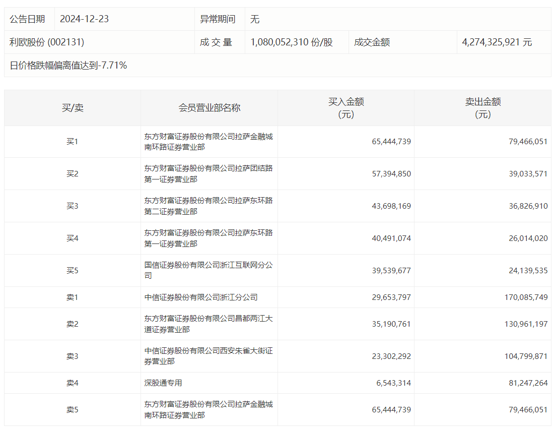 利欧股份今日跌停,龙虎榜数据显示,上榜营业部席位全天成交10.34亿元,占当日总成交金额比例为24.19%。其中,买入金额为3.41亿元,卖出金额为6.93亿元,合计净卖出3.51亿元。