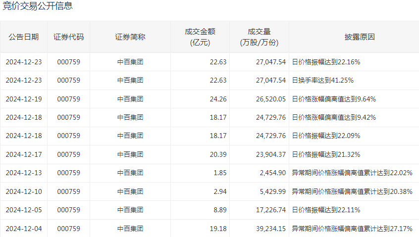 12月23日,因“日价格振幅达到22.16%”且“日换手率达到41.25%”,中百集团本月第8次登上龙虎榜,当日成交额22.63亿元,成交量2.7亿股。