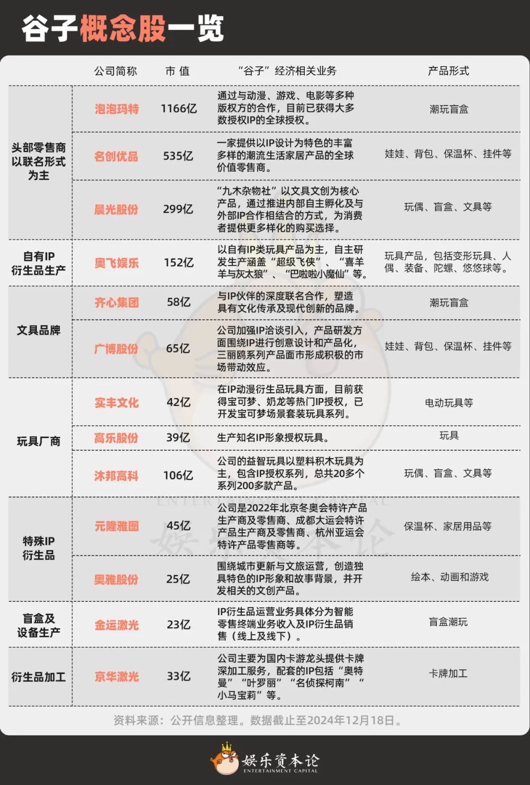 小娱整理了被讨论较多的部分谷子经济概念股。在整理的过程中,小娱发现部分被列入谷子经济概念的公司生产的产品和IP的实际关联非常有限;部分公司的商品虽然也有IP授权成分,但其形式也与市场公认的谷子形式相去甚远。这一点倒是很像前几天暴涨5亿的短剧概念股华菱精工,其背后也是一家名不见经传的短剧公司(点击可阅读)。
