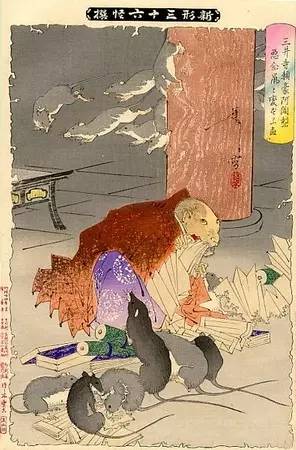 还有一种说法,在平安时代,赖豪阿哲梨为给白河天皇的皇子祈福,想在三井寺建祭坛,然而主管三井寺的比睿山不允许他这样做。阿哲梨一怒之下绝食而死,其怒气化作8400只铁牙老鼠,一夜之间将比睿山的典籍咬烂。