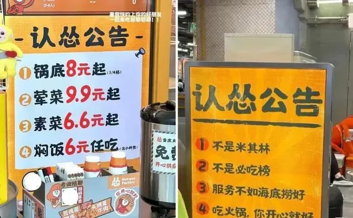 6月,怂火锅贴出“认怂公告”,喊出“锅底8.8元起、荤菜9.9元起、素菜6.6元起、焖饭6元任吃”的口号,菜品价格降幅在0.9元至14元之间。