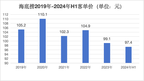 持续平价尝试之后,海底捞的人均消费也从2020年的110.1元降至2024年上半年的97.4元,跌破百元大关。