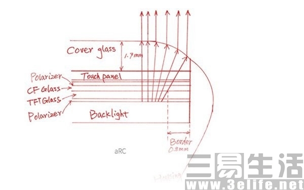 这些手机的实际边框虽然也做得很窄,但是仍然达不到无边框效果,所以为了掩盖边框,工程师们想出了一个绝妙的法子:光线折射。从下图可以看出这些手机使用的2.5D玻璃比我们常见的还要厚不少,并且边缘的弧度也更强,所以会将屏幕的边缘放大、边框缩小,这就达到了视觉上的无边框,甚至有一些曲面屏的错觉,所以在使用这些手机的时候,用户从某些角度上可以看到屏幕的像素被放大了。