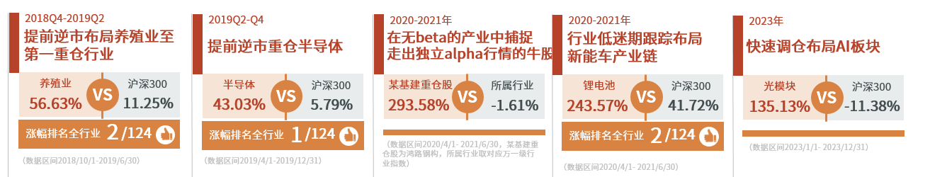 2018年四季度,国内非洲猪瘟蔓延、猪价仍处于下跌进程,他果断加仓养殖板块至第一重仓行业。并预测猪价的历史高点出现在2019年三季度,2019年10月前果断减仓离场。2018Q4至2019Q2重仓期间,养殖业涨幅56.63%,排名行业第二④。
