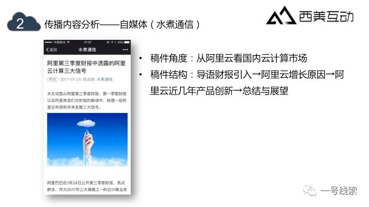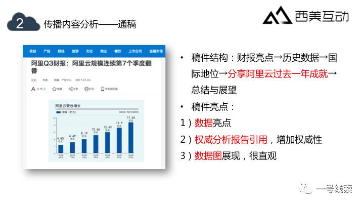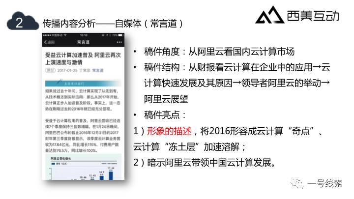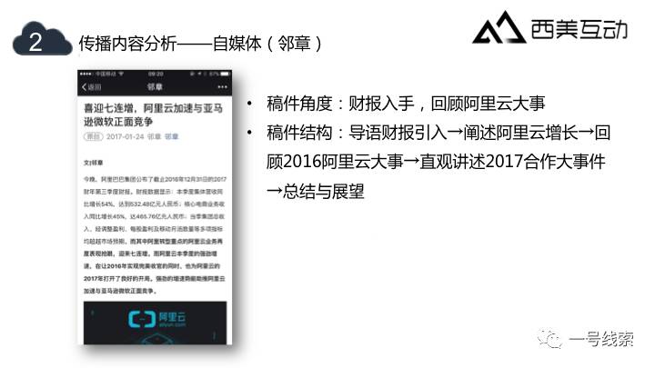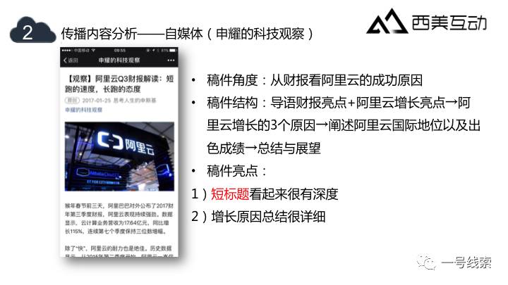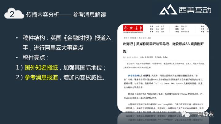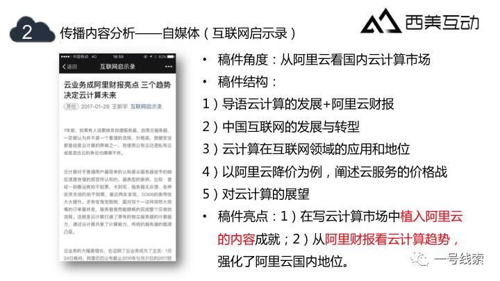 单从内容上来看,阿里云显得不拘小节。无论是自媒体解读,还是网站媒体,又或是通稿,稿件结构比较单一,但是其标题却是十分响亮。第一轮传播,从自媒体解读的标题上看来,阿里云的目的就可见一斑;第二轮传播,目的则更加强烈。