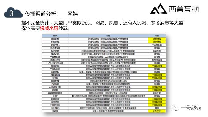 众所周知,阿里的媒体渠道网络神通广大,但是在渠道打法上阿里云有自己独特的套路。此次Q3财报传播中,阿里云重点传播渠道为以下6类: