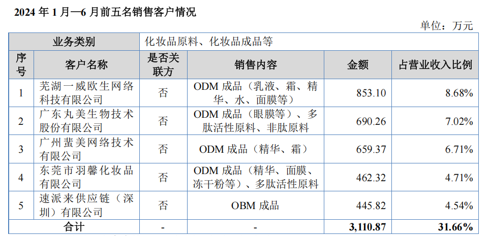 2024年上半年,维琪科技前5大销售客户占总营收比重为31.66%,前3大客户分别为芜湖一威欧生网络科技有限公司、广东丸美生物技术股份有限公司(下称丸美生物)、广州蜚美网络技术有限公司。值得一提的是,在此之前,丸美已连续两年位列维琪科技第一大客户。