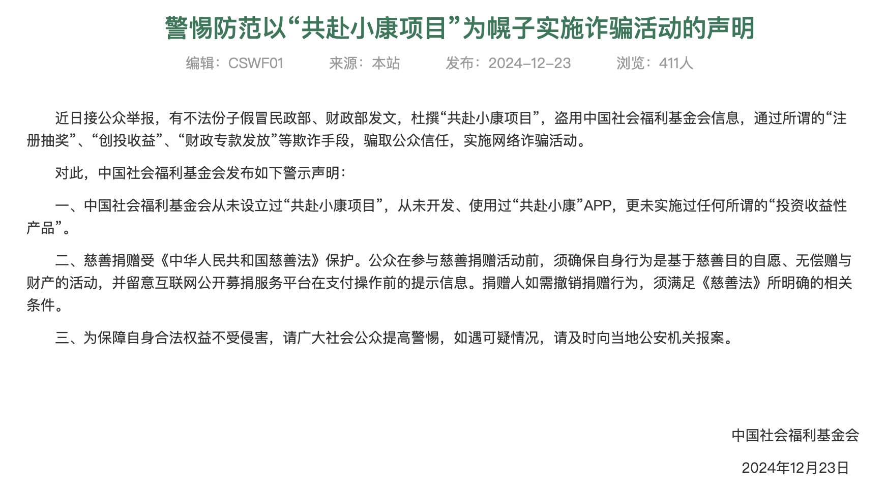 中国社会福利基金会12月23日发文称,近日接公众举报,有不法份子假冒民政部、财政部发文,杜撰“共赴小康项目”,盗用中国社会福利基金会信息,通过所谓的“注册抽奖”、“创投收益”、“财政专款发放”等欺诈手段,骗取公众信任,实施网络诈骗活动。