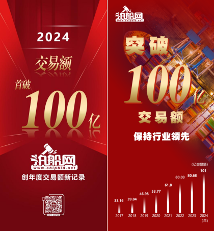 12月23日,随着价值约4亿人民币的海洋平台成功交接,浙江拍船网航运交易股份有限公司(以下简称“拍船网”)2024年船舶交易总额达到了101亿人民币,同比增长超过25%。这标志着拍船网年度交易额首次突破“100亿”大关,成为我国首个年度交易额实现“100亿”的船舶交易平台。