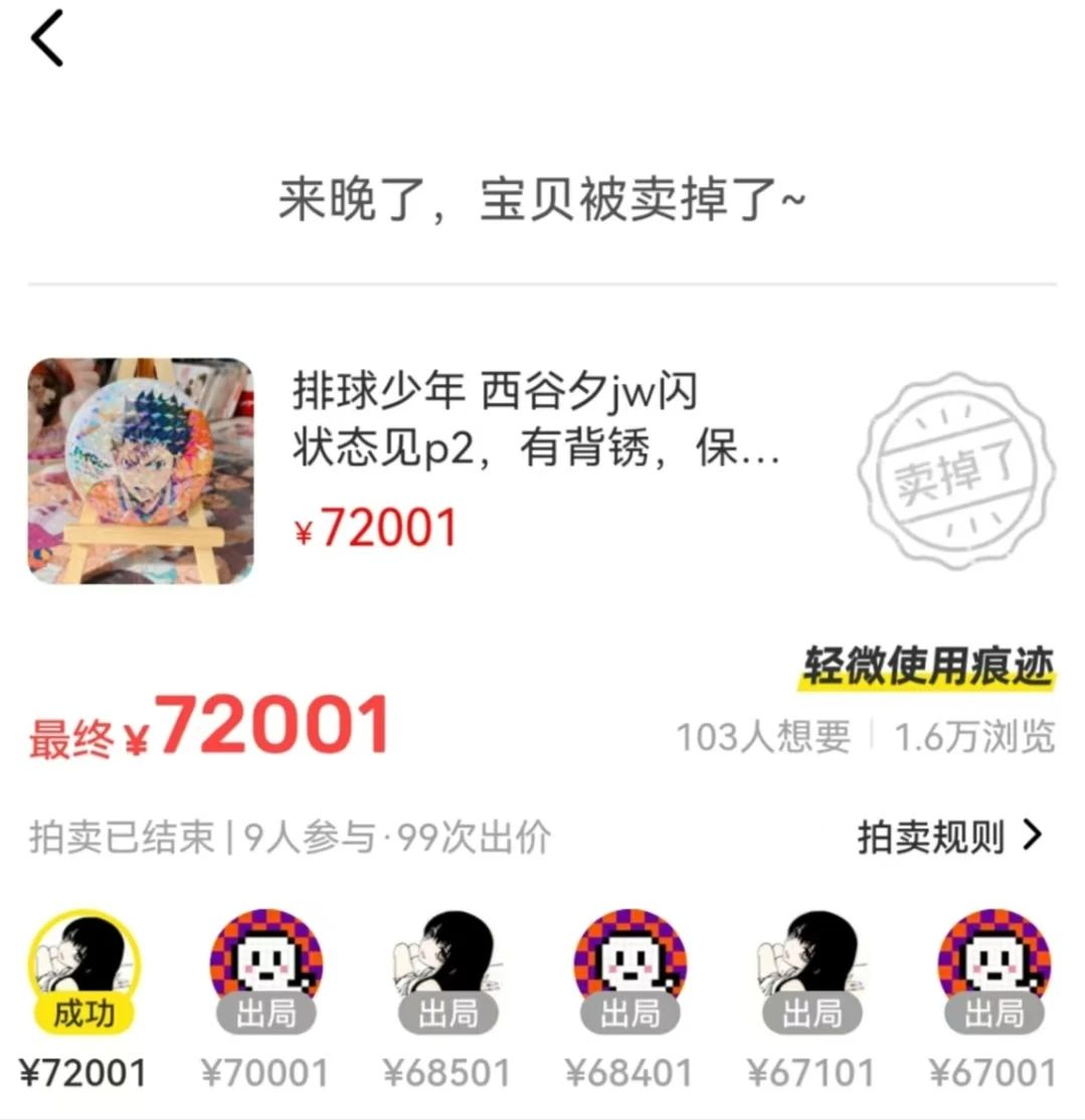 “谷子”,音译自“Goods”,在经历日文转译后与原本“货品”的含义产生偏移,意指部分二次元周边,如“吧唧”指的是badge徽章;“透卡”是印着动漫人物的透明卡片等等。一块《排球少年》角色的吧唧在二手平台上被炒到了7.2万元,传说中这款吧唧全球限量5枚。