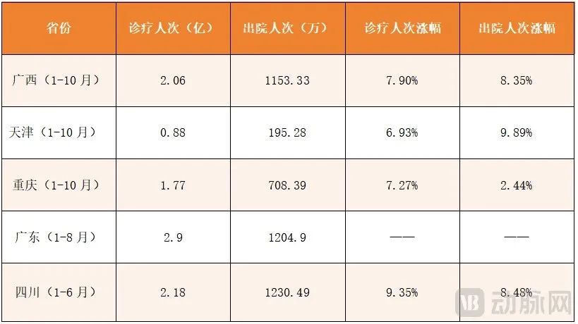 2024年全国医疗机构的服务总量与服务效率提升明显。截至11月底,全国共5个省份/直辖市公布了2024年部分时间段内医疗服务数据,从中可以窥见医疗服务供给在不同地区均呈现出增长态势。