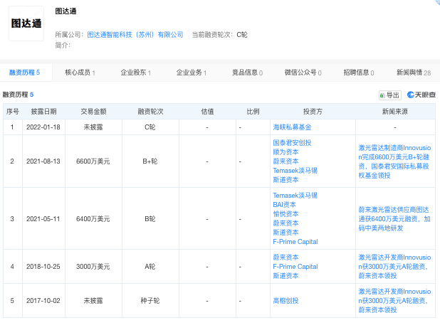 天眼查App信息显示,图达通至今完成了五轮融资,投资方包括高榕创投、蔚来资本、淡马锡、BAI资本、愉悦资本、顺为资本、斯道资本、国泰君安创投等。