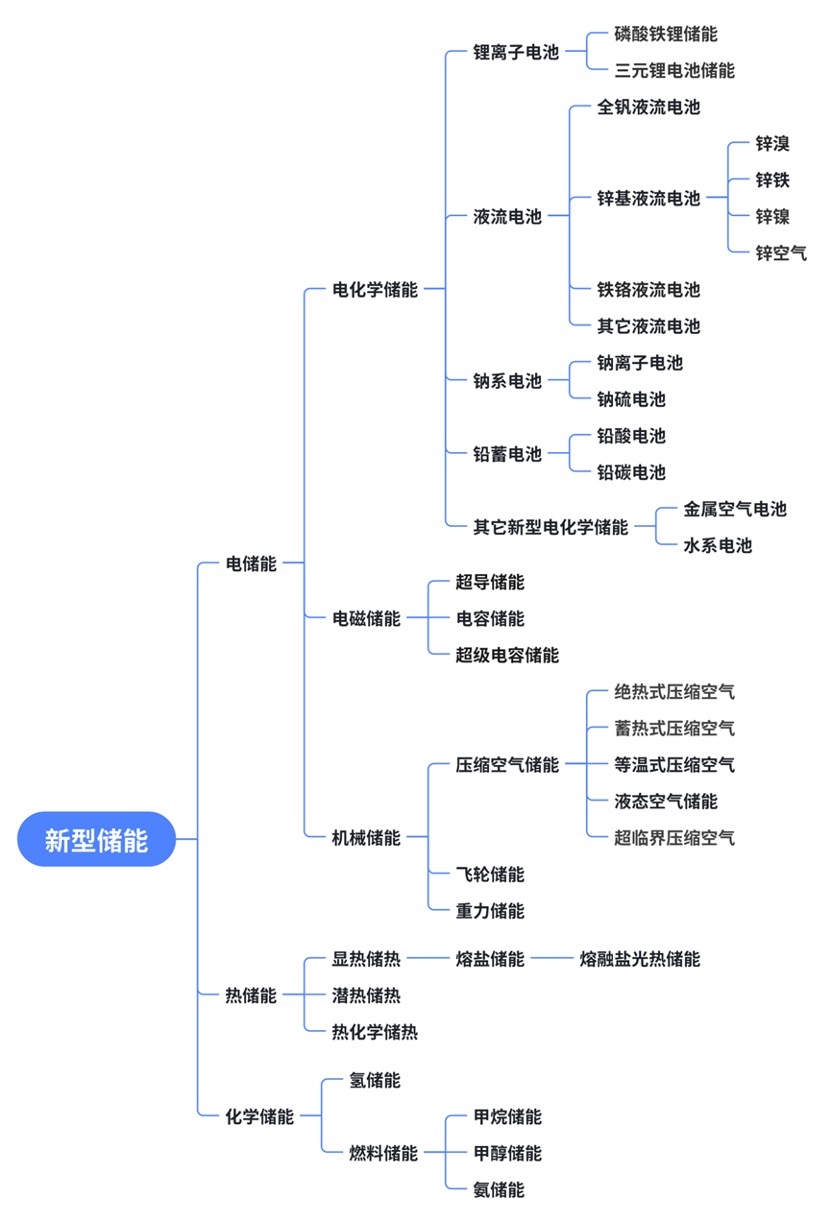 新型储能发展呈现出多种技术路线,这些路线大体上可以划分为电化学储能、电磁储能、机械储能、热储能以及化学储能等(见下图)。