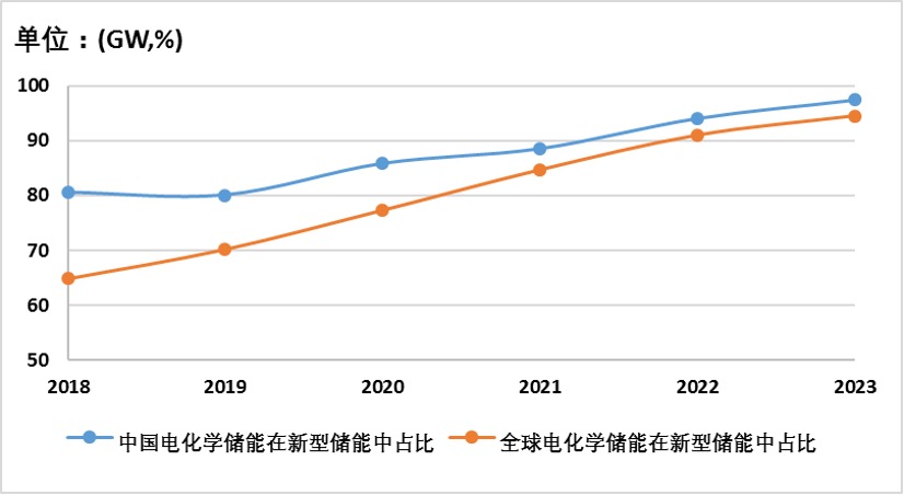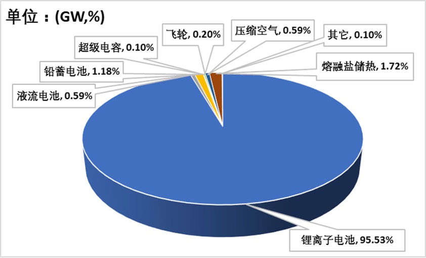 在中国和全球新型储能市场,锂离子电池储能遥遥领先。在中国,锂离子电池储能的占比达到了95.53%。