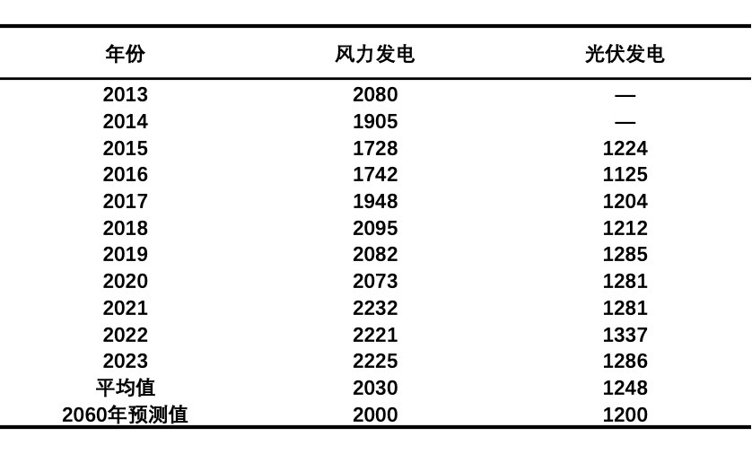 根据以上报告统计,我们假设,未来光伏发电可利用小时数为1200小时/年,风力发电为2000小时/年,具体如表2-1所示。