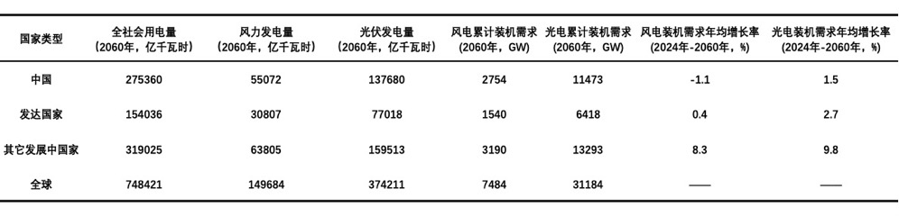 我们以新增风光装机容量来表示风光发电装机需求。根据以上假设,2060 年,中国、发达国家及其他发展中国家的风光累计装机需求及年均增长率预测结果如表2-2所示。