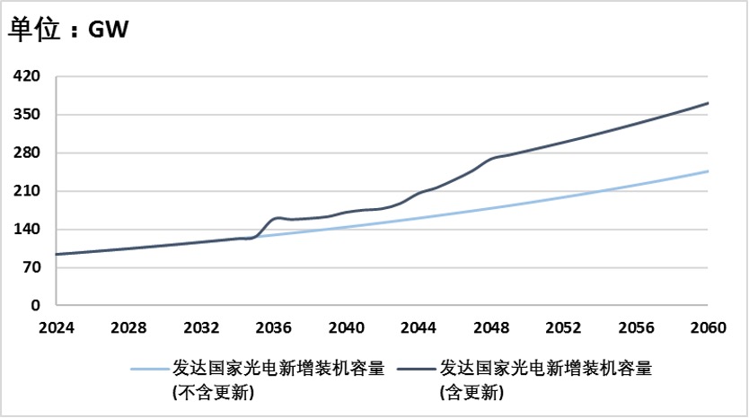 2、发达国家经济体。其经济增长虽然表现为与能源消耗总量弱相关,但近年来兴起的数据中心和人工智能等却是高耗能产业。考虑到当前发达国家的人均发电量已超过8000千瓦时/年,我们假设到2060年其人均用电量会增加到12000千瓦时/年,为《光伏大战⑤:如何越过“万重山”到达彼岸?》中假设的2倍。