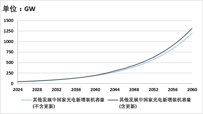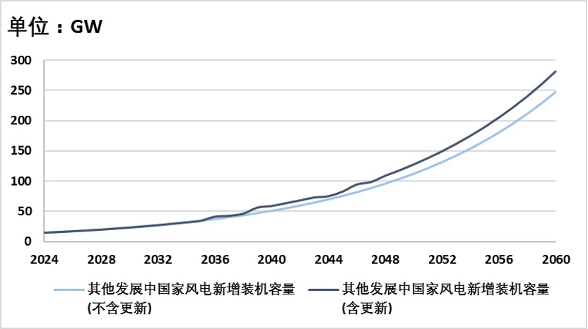 其他发展中国家2024年光电新增装机预计可达42 GW,到2060年至少增加到2024年的28.6倍;风电装机在2024年可达14 GW,到2060年至少增加到2024年的17.4倍。