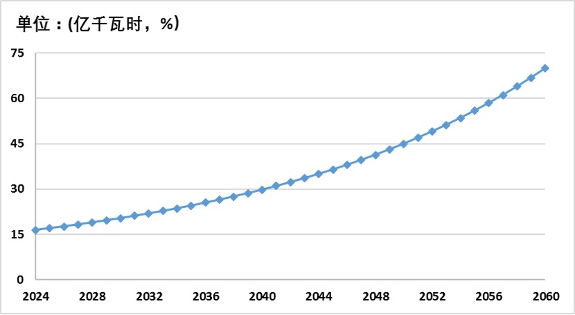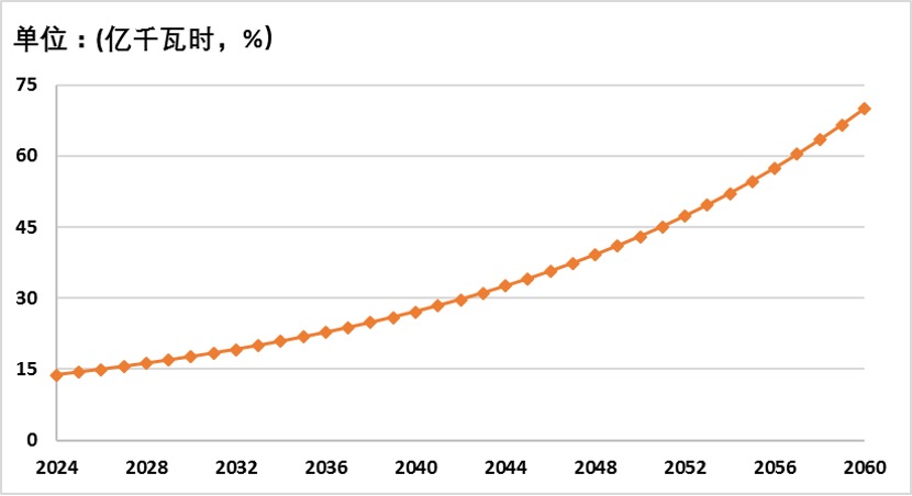 基于国家统计局公布的2023年中国风光发电量和全社会发电量数据,再结合上文对2060年各发电量的预测,我们估算出风光发电的年均复合增长率分别为5.1%和8.9%。以此为基础,中国风光发电量的占比变化如图3-1所示。