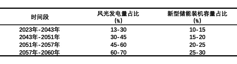 考虑到新型储能需求会随着风光发电比例的增加而增加,我们假设中国风光发电量占比与新型储能装机容量占比的关系如表3-1所示,且后者在各区间内匀速增加。