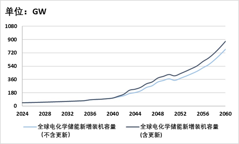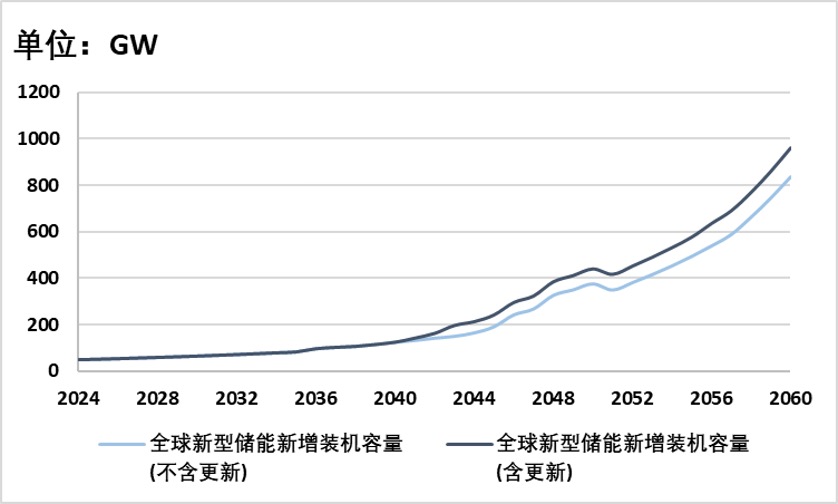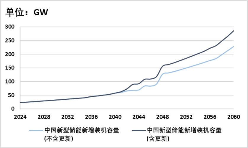 从2024年到2060年,不论是中国还是全球,新型储能装机需求都随着时间的推移而不断增加。特别是到了2060年,即使不考虑更新,中国的新型储能装机需求也会达到228 GW,约为2024年的10倍;全球的新型储能装机需求则会达到837 GW,约为2024年的17.3倍。