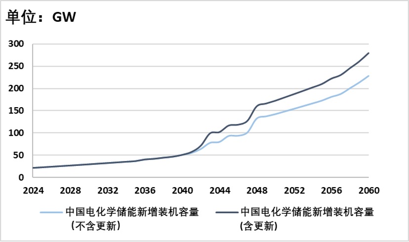 从图中可以看出,中国的电化学储能装机需求将从2024年的22 GW增加到2060年的228 GW,大约增加了9.4倍。如果考虑设备更新,2060年的需求量将达到279 GW,大约相当于2024年的12.7倍。