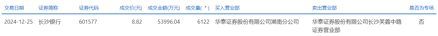长沙银行今日大宗交易成交6122万股,成交额5.4亿元