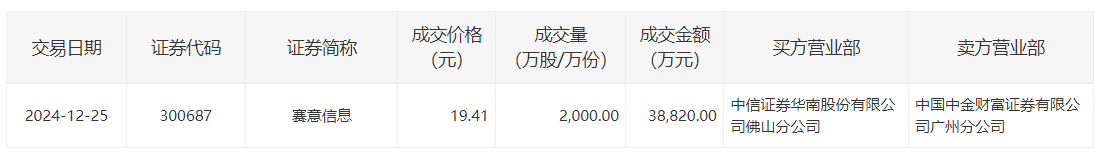 赛意信息今日大宗交易溢价成交2000万股,成交额3.88亿元