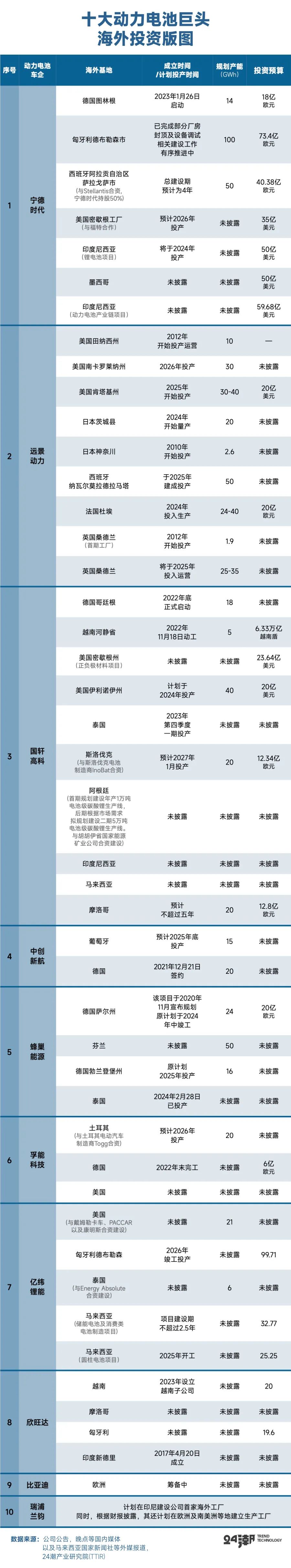 据24潮产业研究院(TTIR)不完全统计,截至目前,宁德时代、远景动力、国轩高科、中创新航、蜂巢能源、孚能科技、亿纬锂能、欣旺达等10家动力电池巨头都开始计划或者已在海外有深度的产业布局,其公开对外披露的/媒体公开报道的投产/计划建设的海外工厂已近50个,总投资预算超5500亿元人民币。