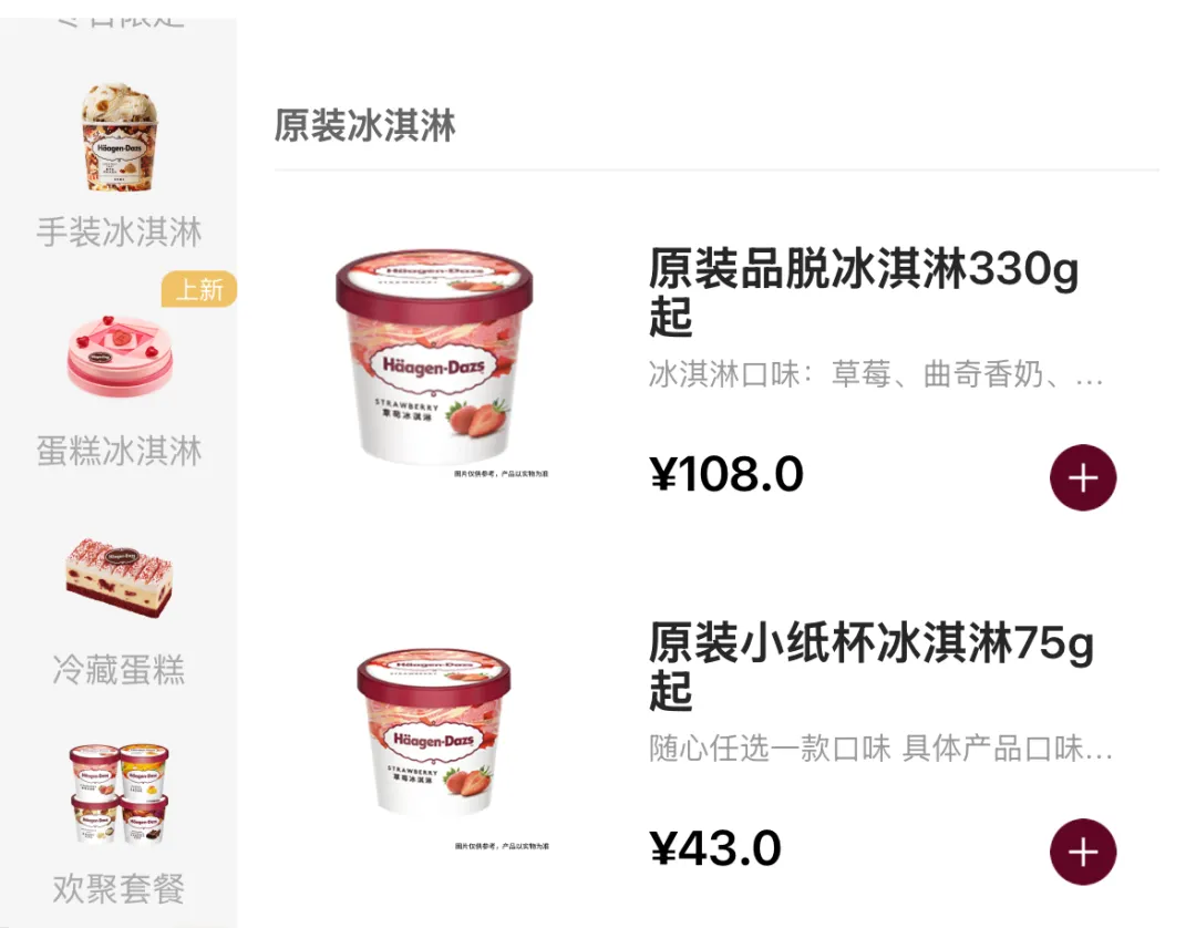 但在中国,哈根达斯一款75g原装小纸杯冰淇淋售价43元,330g的大桶装卖到108元,不考虑收入水平,单价格就比其他国家要高。