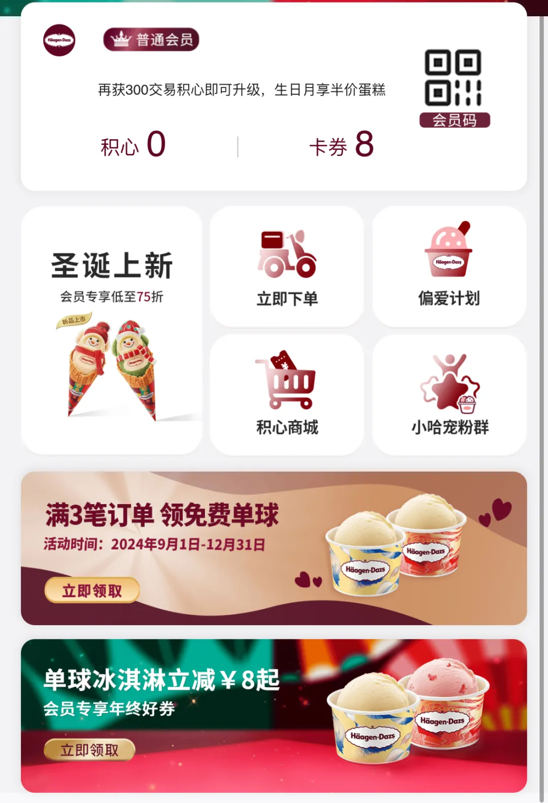 红餐网注意到,目前注册哈根达斯的免费会员就送8折券,每年还能领取单球冰淇淋减8元券,双球冰淇淋减20元券等。此外,今年以来,哈根达斯也不止一次推出59元2份、69元2份手装单球冰淇淋的优惠活动。