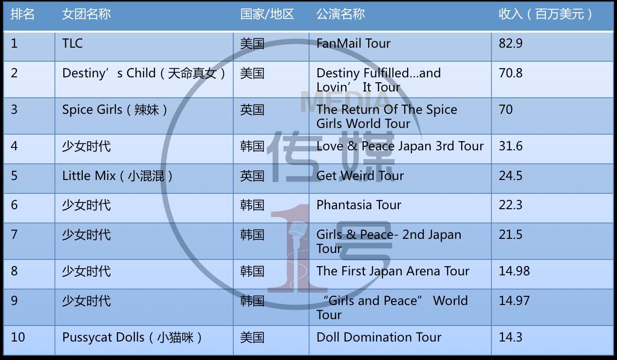 ▲表1:全球历代女团巡演卖出额Top10